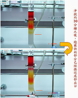 圖15. 隨著時間不斷前進,我們所需要的成分也離出口越來越近了。上一集的內容裡不是請大家猜猜看我們真正所要的成分是什麼顏色嗎?答案就在這裡:橘色!意思就是那些鮮豔紅色與黃色的部分都是雜質!我們需要的就僅僅只是圖上這個短短的橘色區間罷了。不過話說回來,我這次純化的技術真的不好,V形流超嚴重!哈哈~ 囧rz